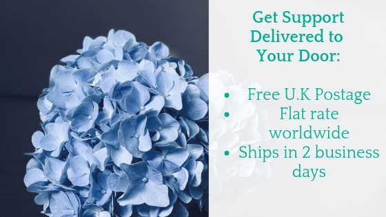 Get comfort delivered to your door: free UK shipping, flat rate worldwide - green text over photo of powder blue hydranger